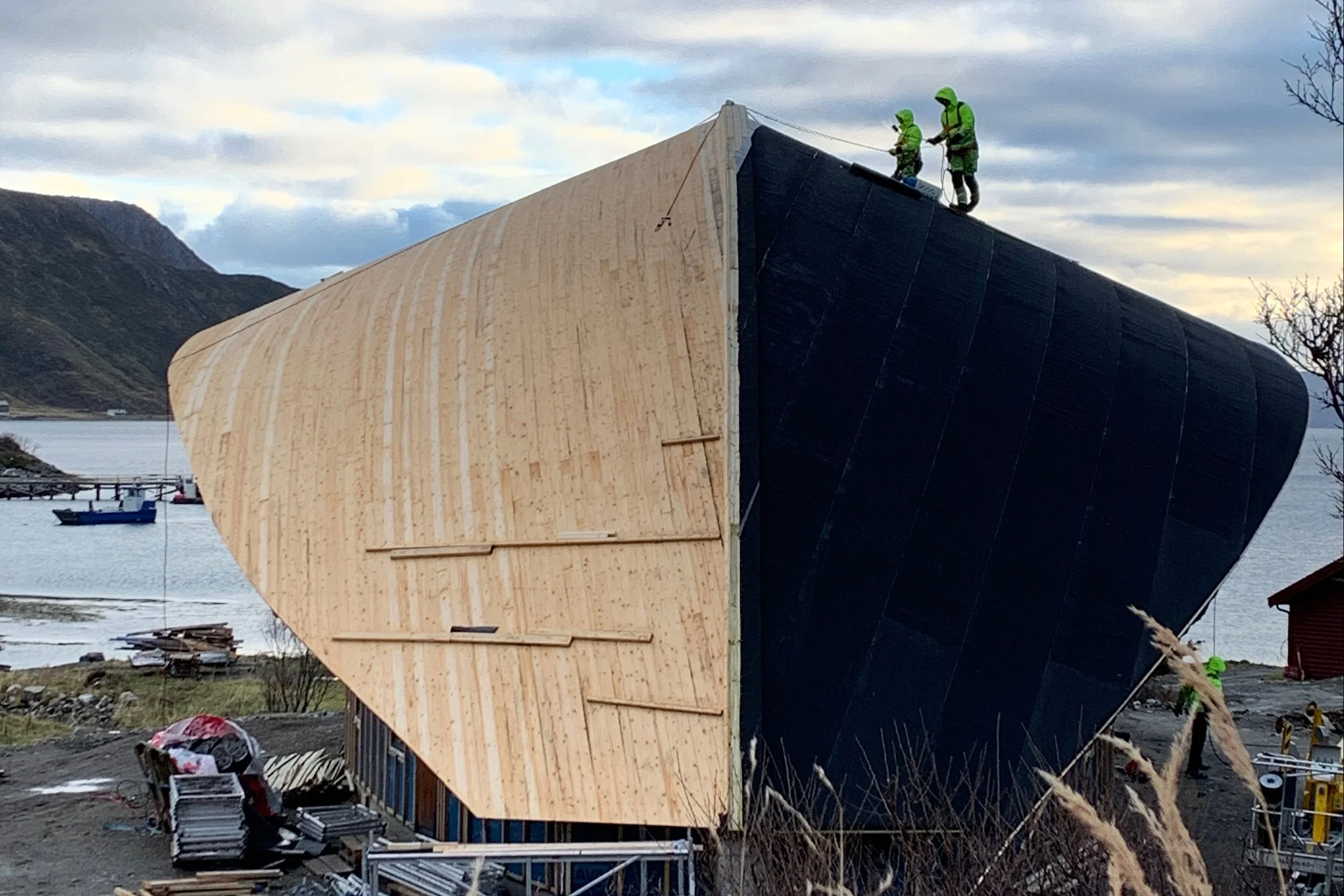Treverket består av kortreist Finnmarksfuru, tjærebehandlet for en vakker patina etter hvert som vær og vind setter sitt preg. Det som er unikt med Finnmarksfuru er at den vokser så sakte at den blir tett og full av kvae, noe som gjør den så stabil at den kan stå i hundrevis av år. Både treverket og etterbehandlingen med tjære er en honnør til sjøsamisk byggeskikk.