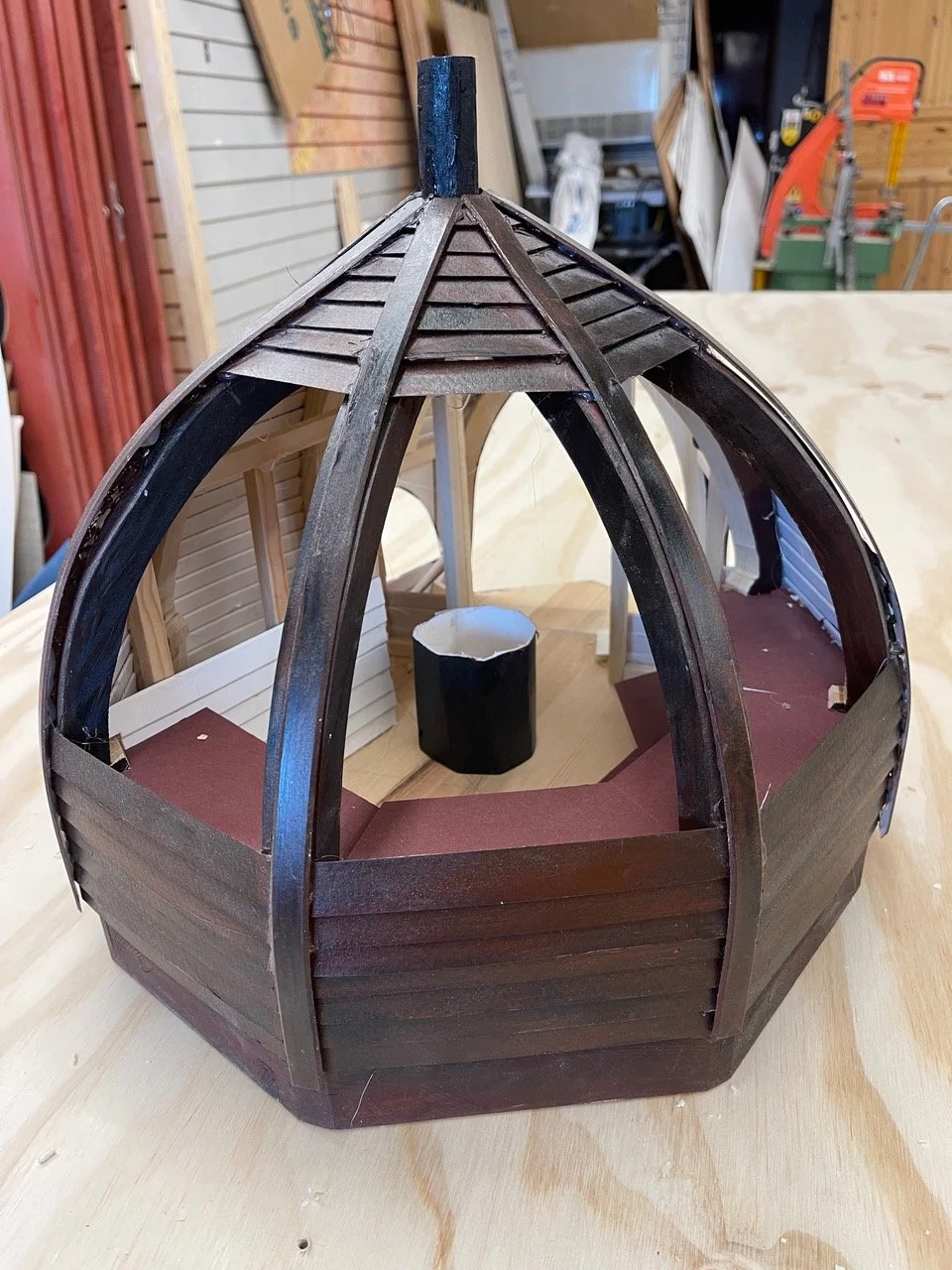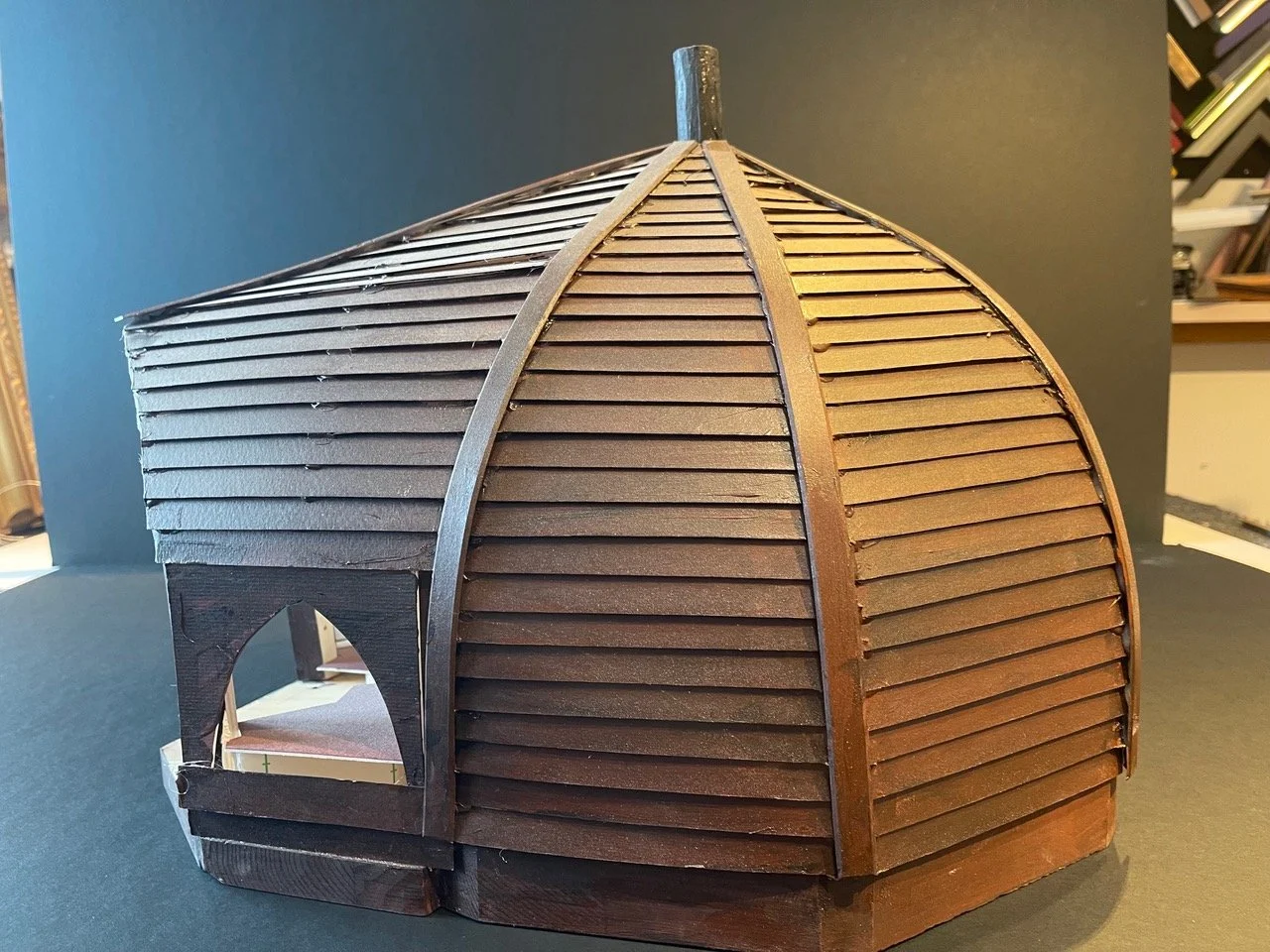 Modellen er laget i målestokk for å kunne bruke de gamle buene til Musikkpaviljongen, buene hadde store råteskader.De er nå reparert og vil tåle å være bæring til ei lita Badstu.