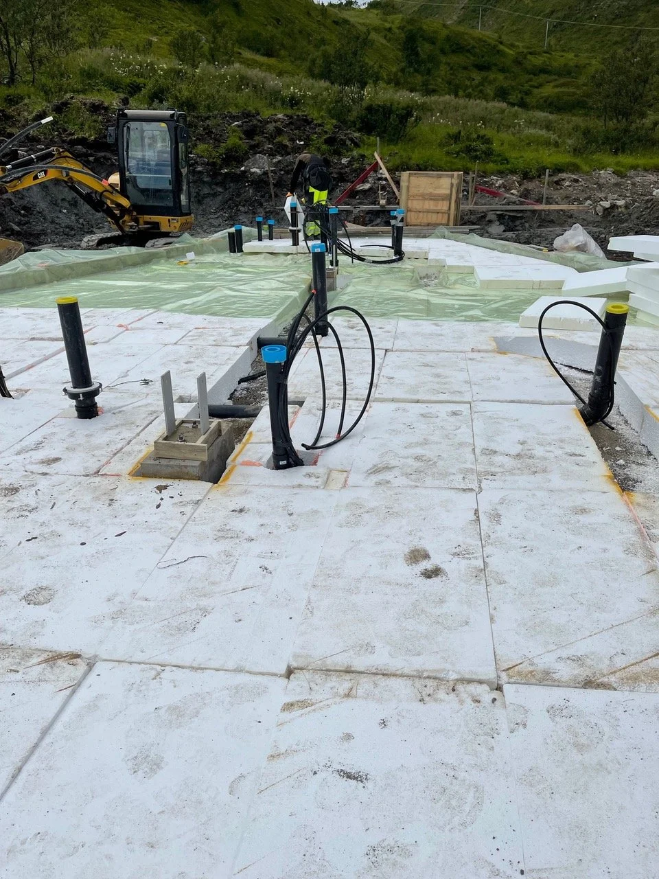 Rørtek har vært å lagt bunnledningene til vann og kloakk.Vi har lagt Radonsperre og legger to lag med isopor 30 cm.