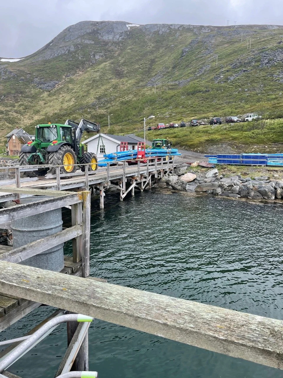 Vi måtte leie inn to traktorer for å få de store buene fra kaia og til mellomlagring.Det var en stor leveranse fra Moelven med limtre.