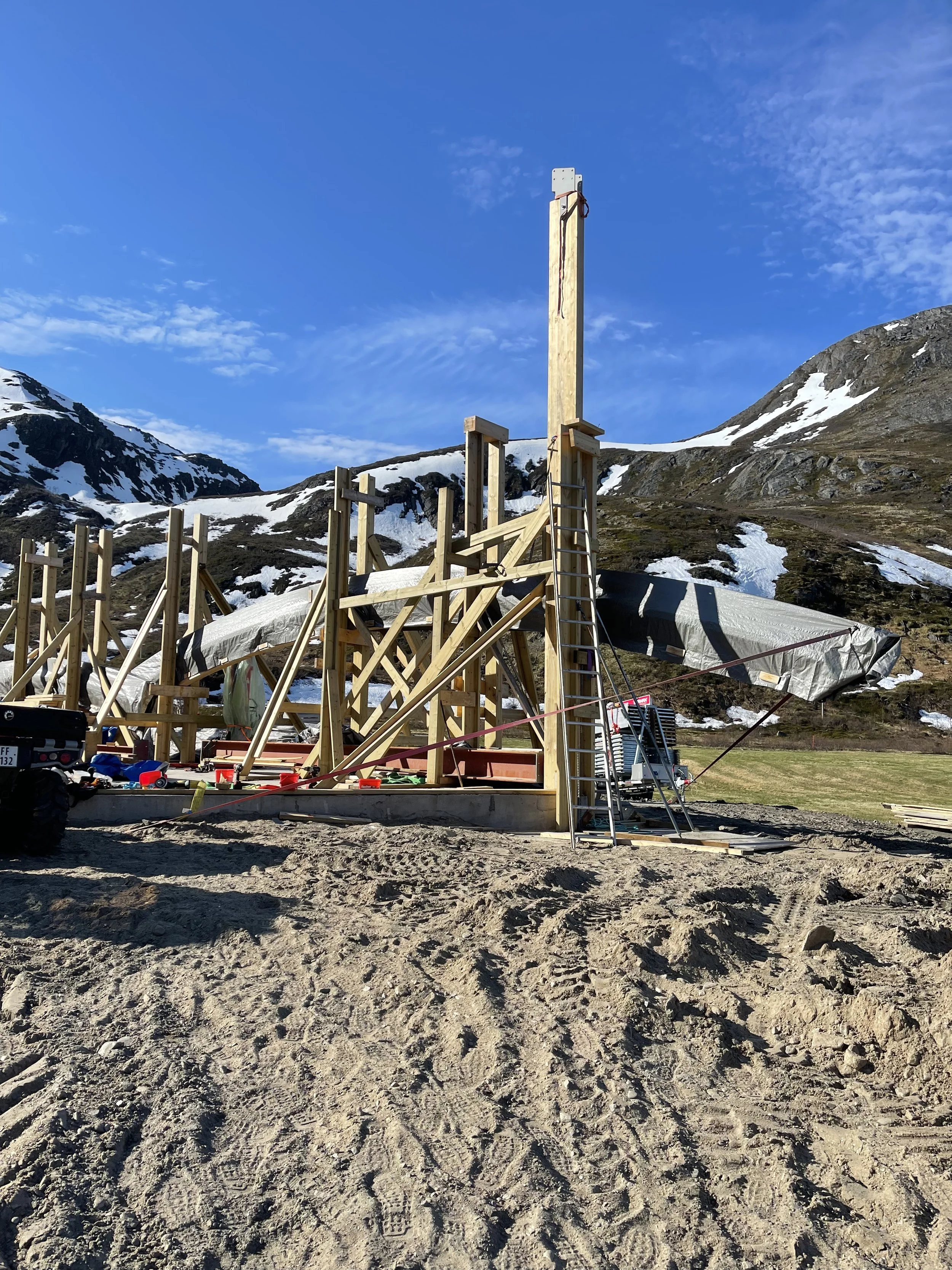 Her vinsjes bære søyla opp- Når den ligger i skrå vinkel får den en stor motkraft - som må vinsjes inn. Man kan se her nederst på søyla at det er en gjennomgående bolt som som vi bruker til feste for å vinsje søyla inn-