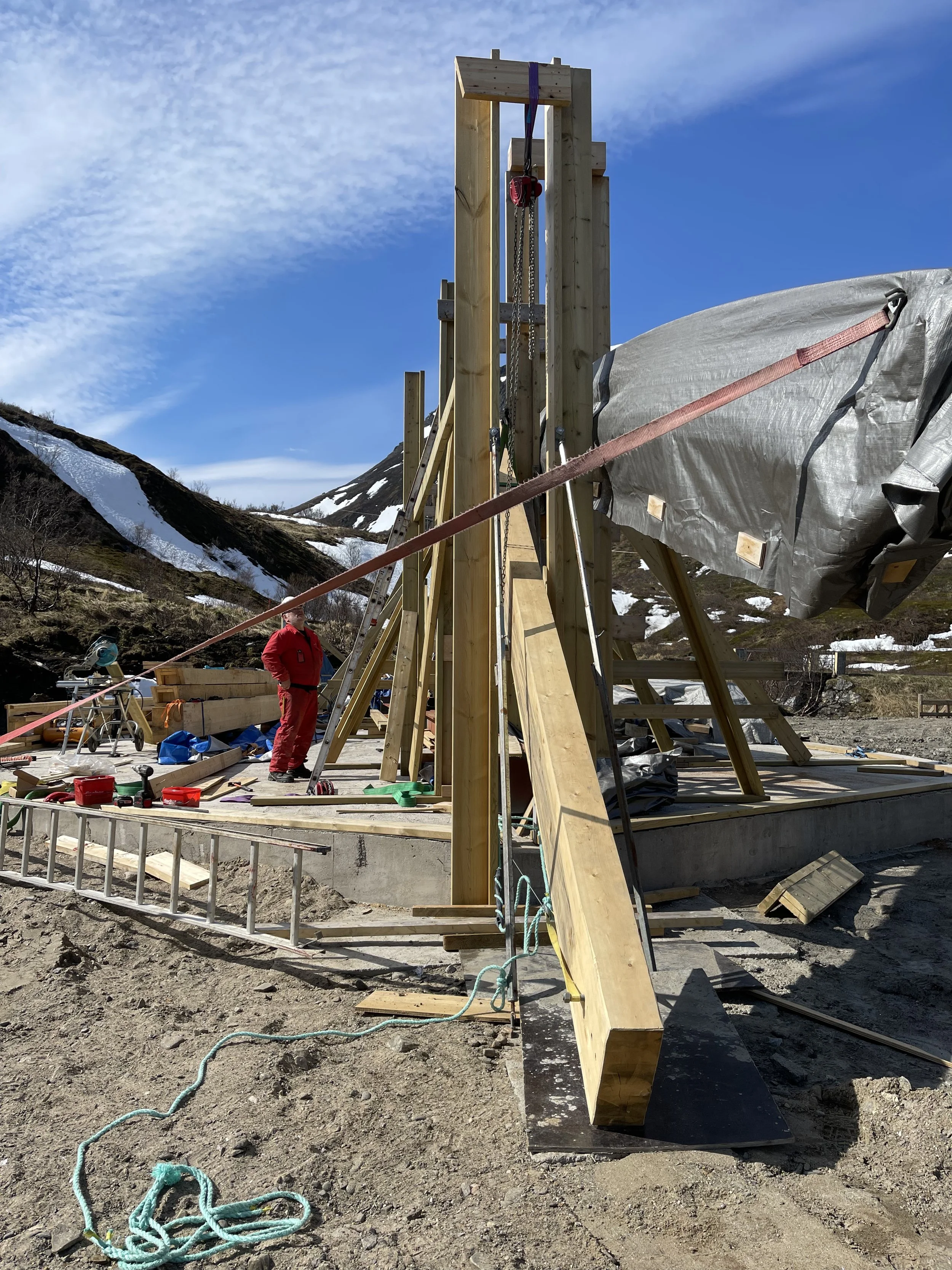 En fin dag sist i mai - Steinar Leistad hjelper til med å sette opp den første søylen. På gammel måten, med vinsj og taljer -