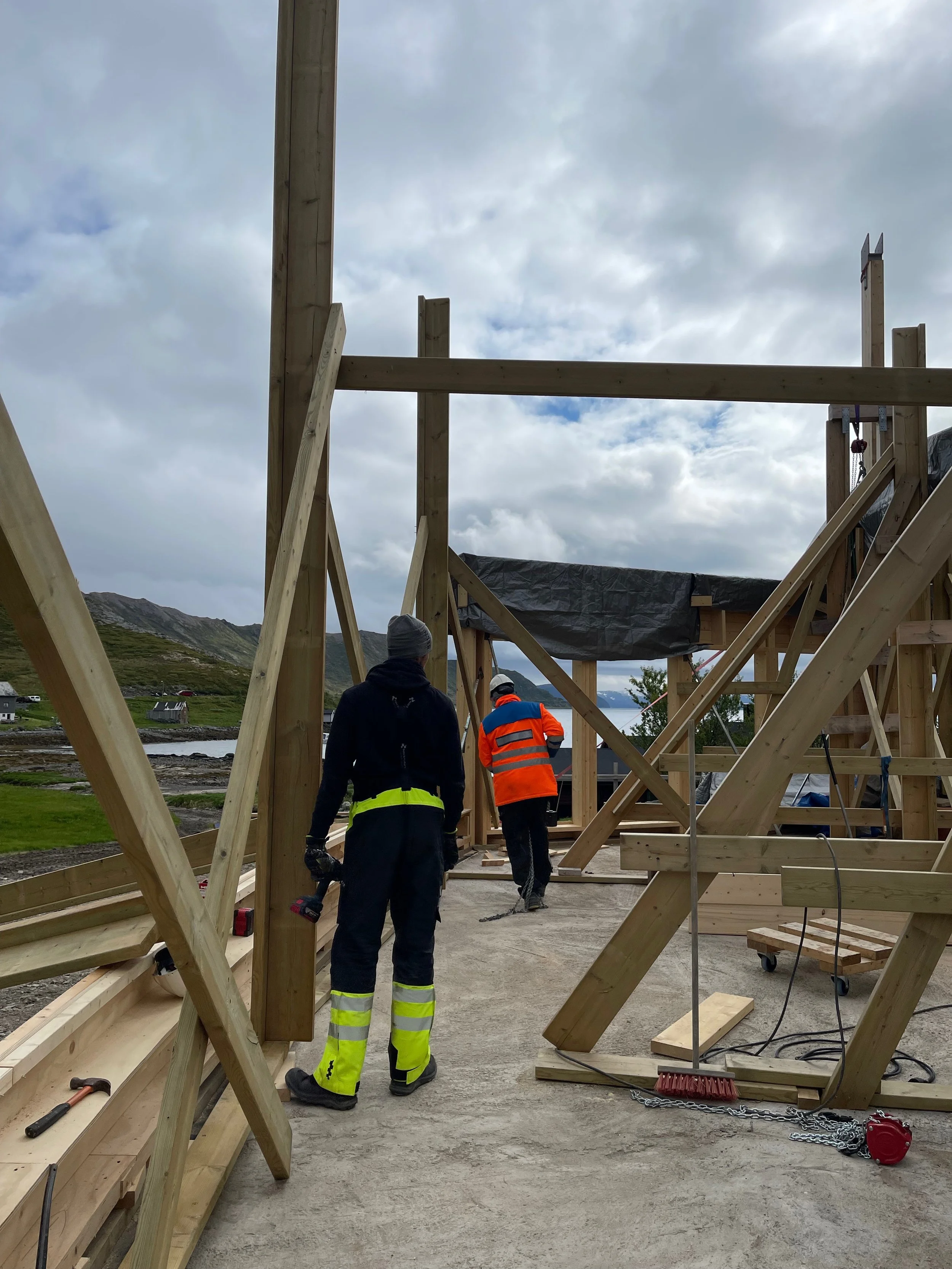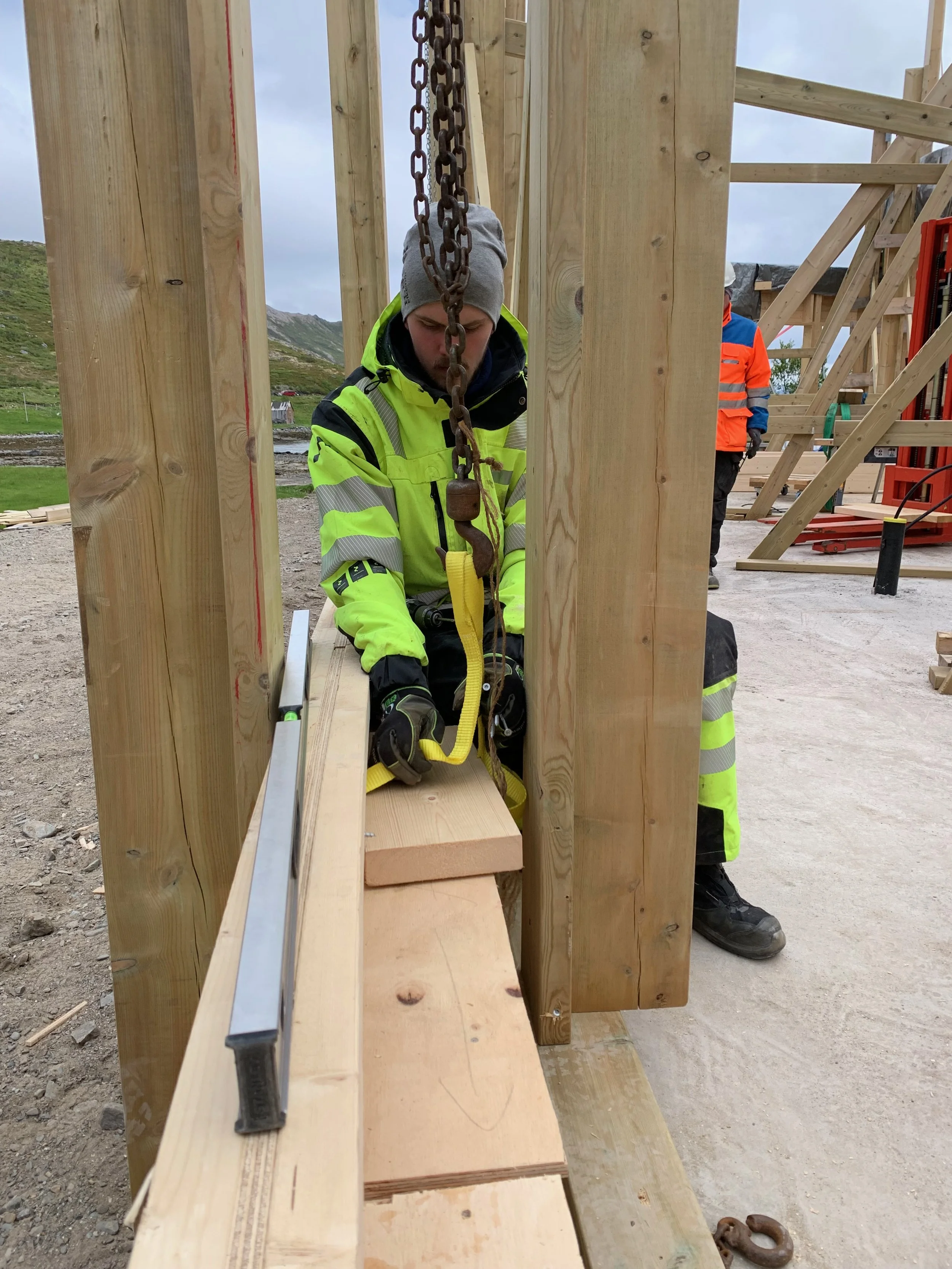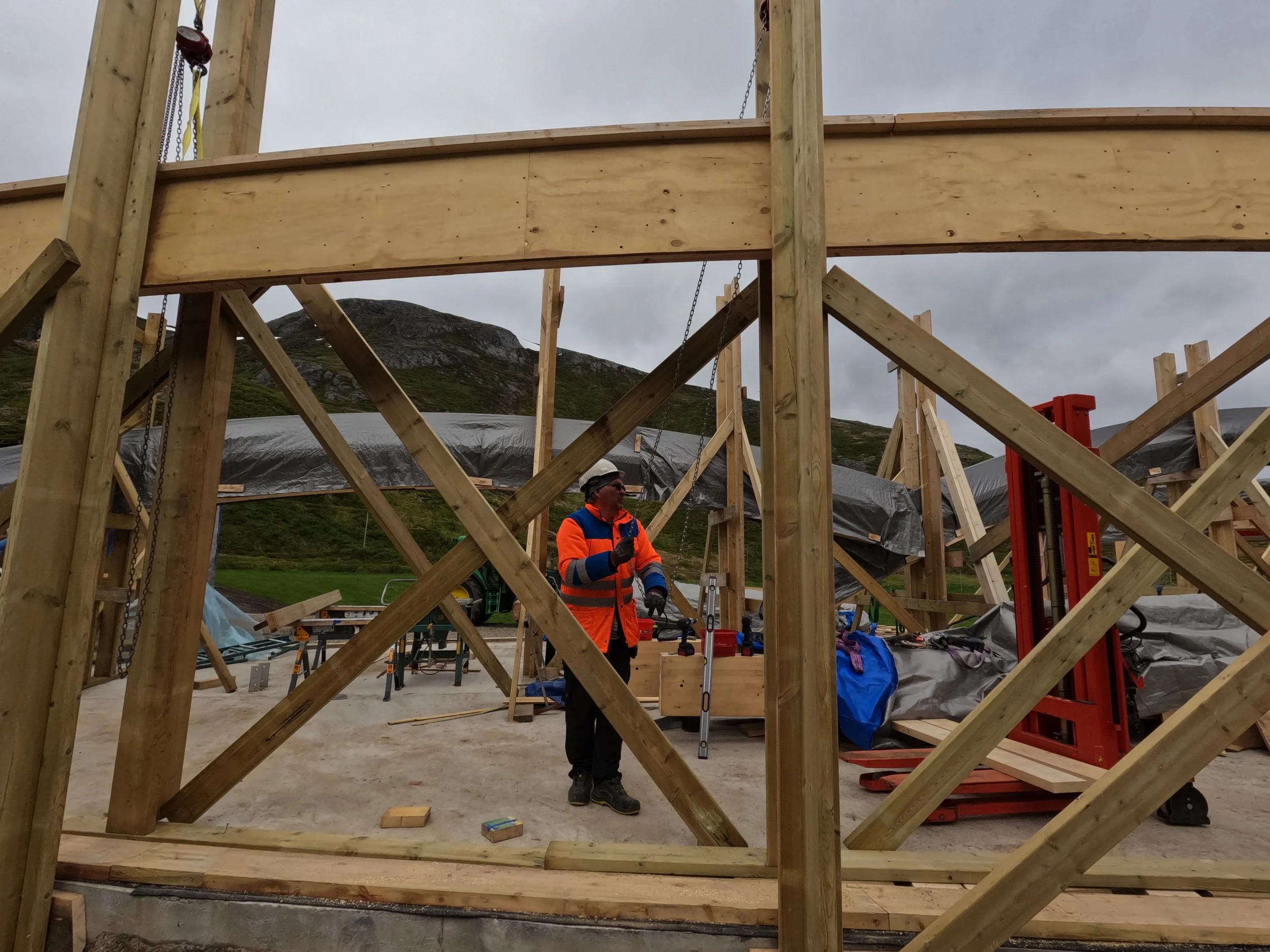 Heis må lages for å løfte opp den 13 m lange buede topplina.