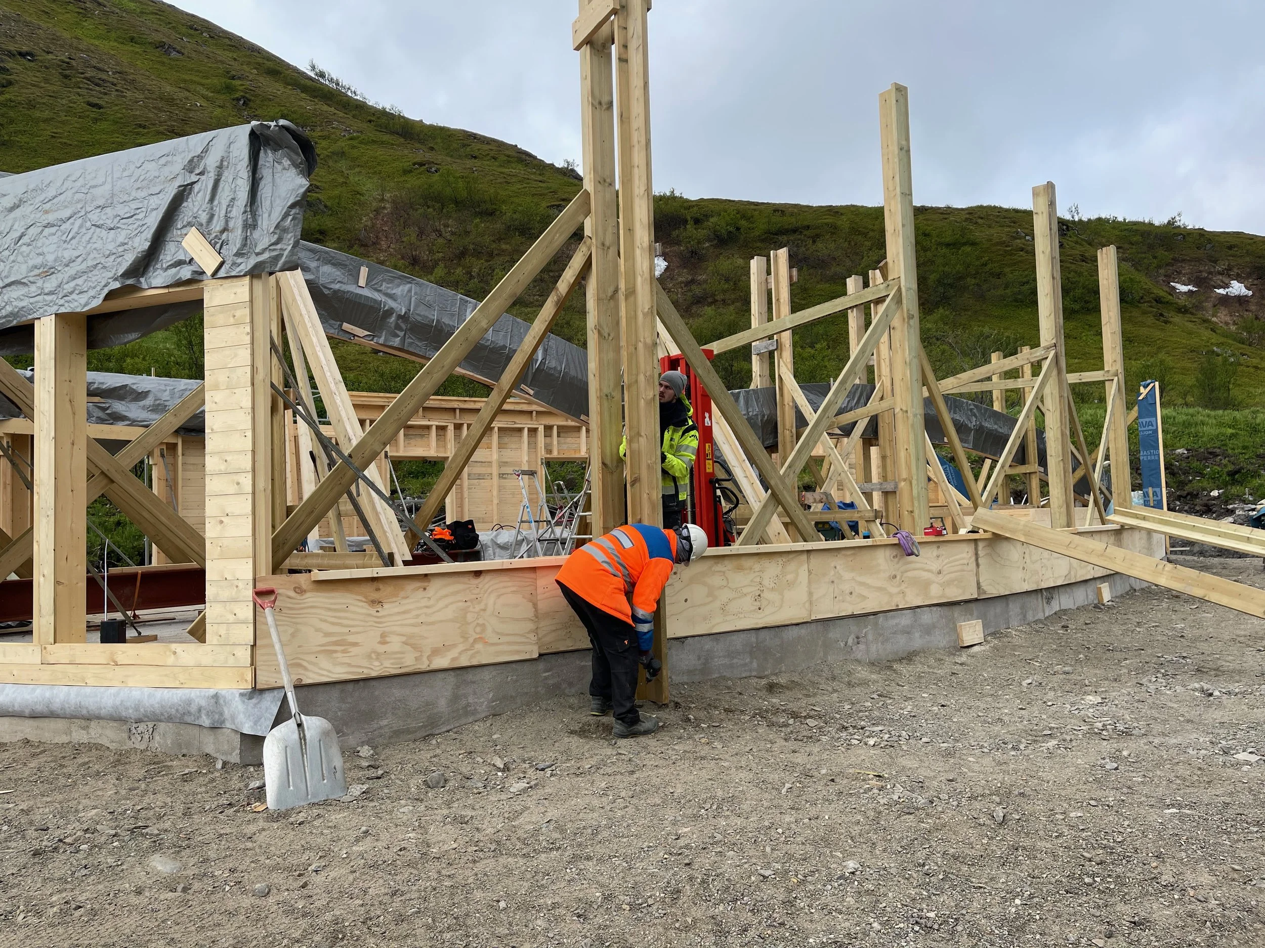 Veggen oppe i riktig høyde og klar for sikring.