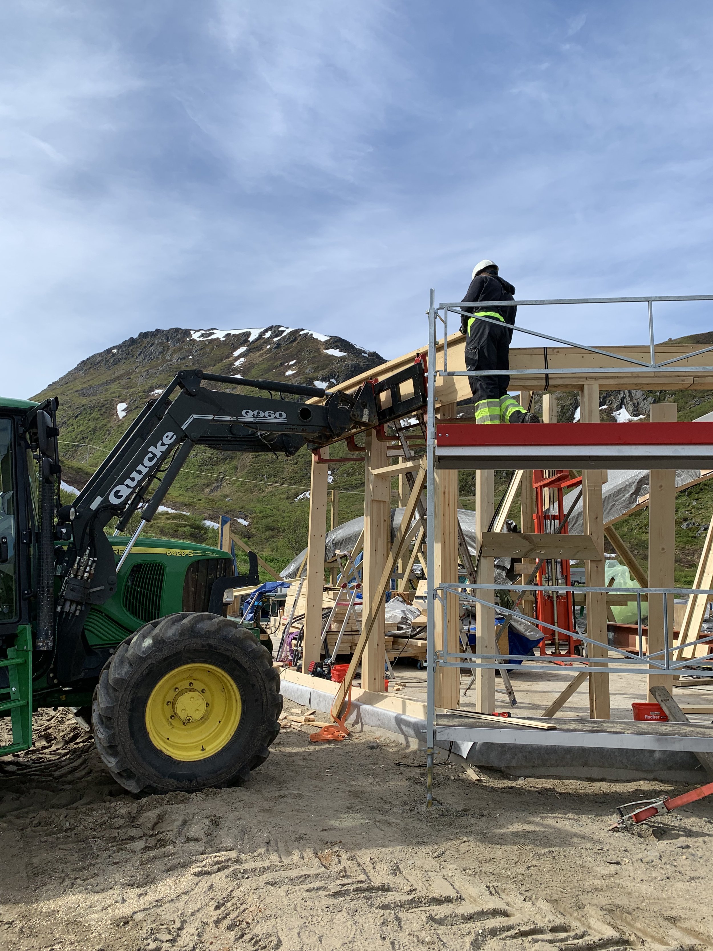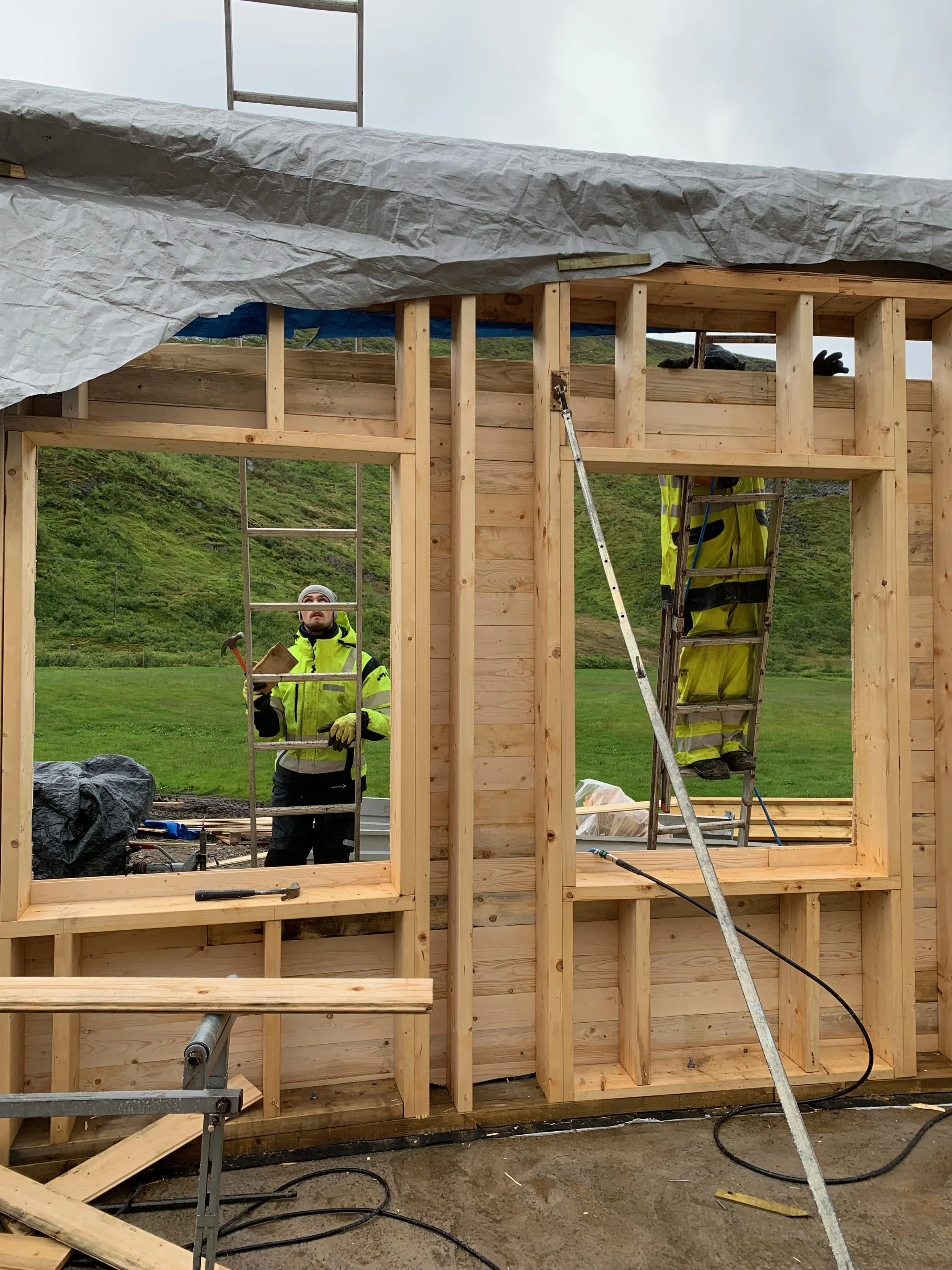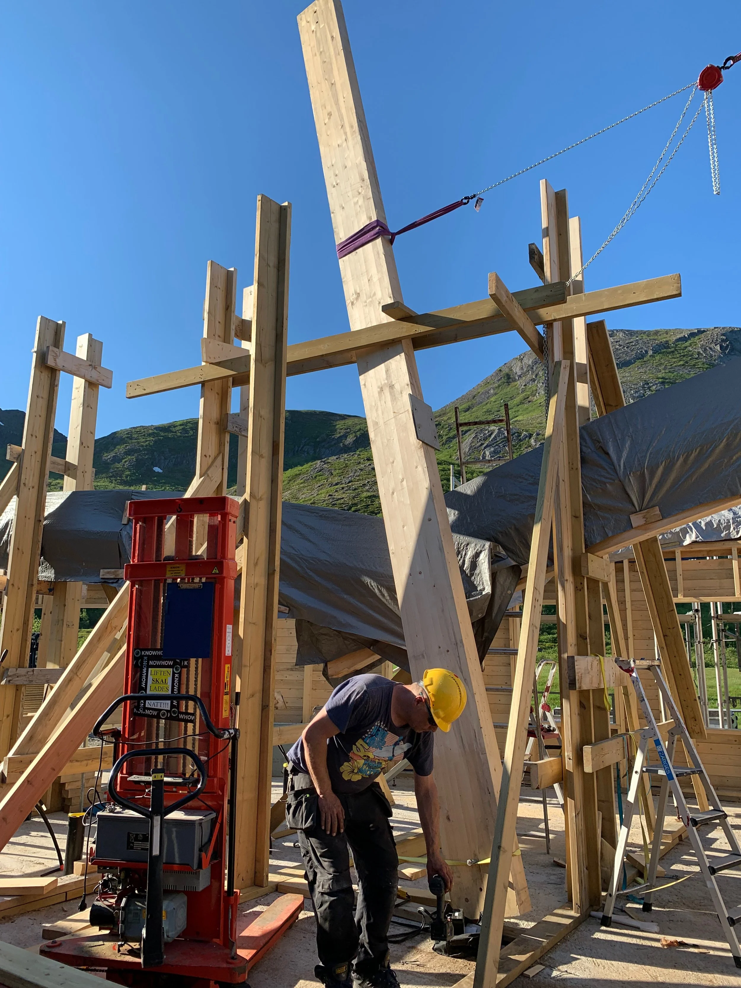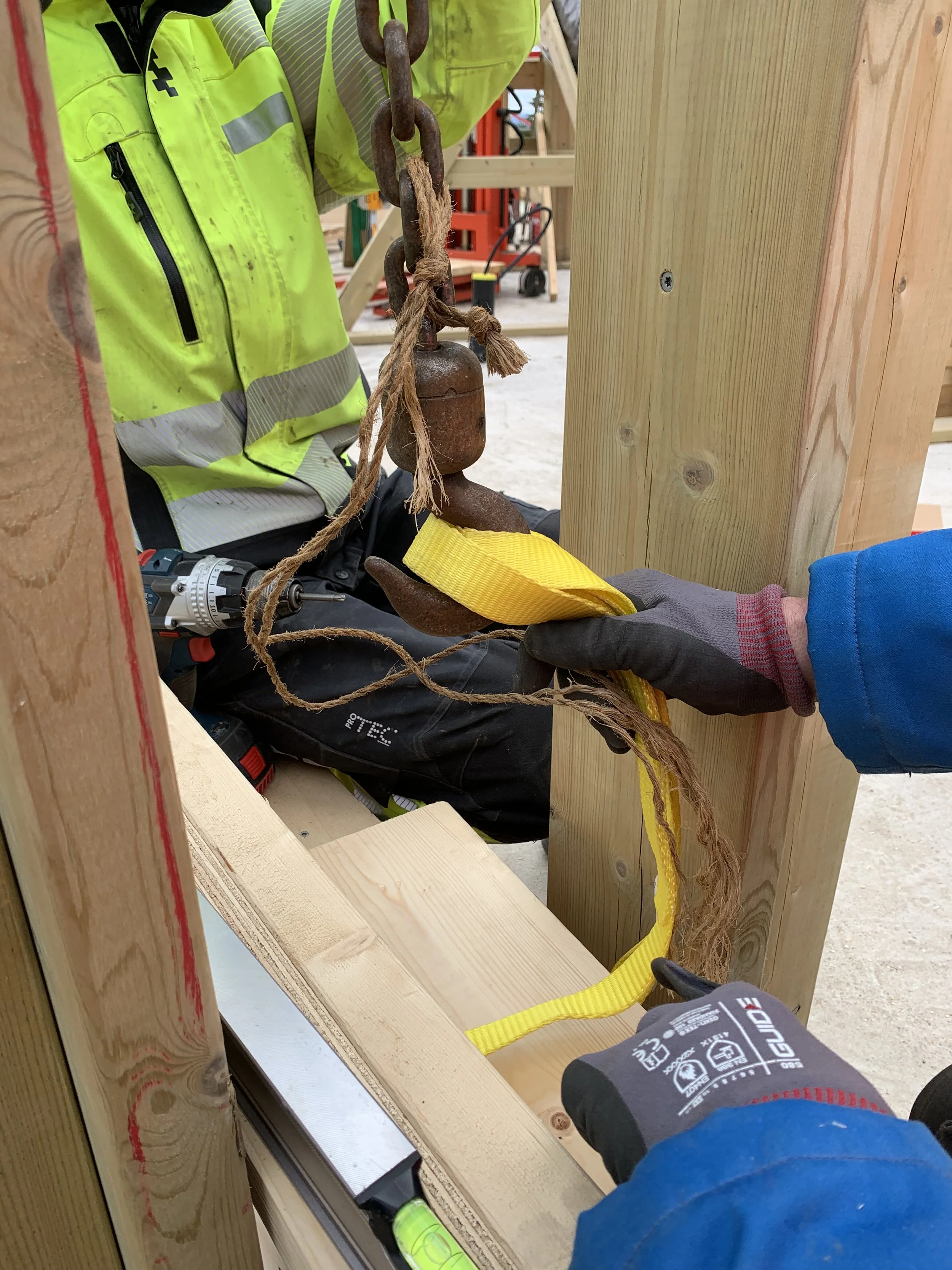 Den lengste buede vegg modulen, skal heises opp til gulv høyde for andre etasje- her skrur de en løfte stropp fast i modulen, under en planke. Det er Knut og Adrian som jobber på og det er interessant å følge med- (“åja, gjør dere sånn? æ trudde …bla bla”)