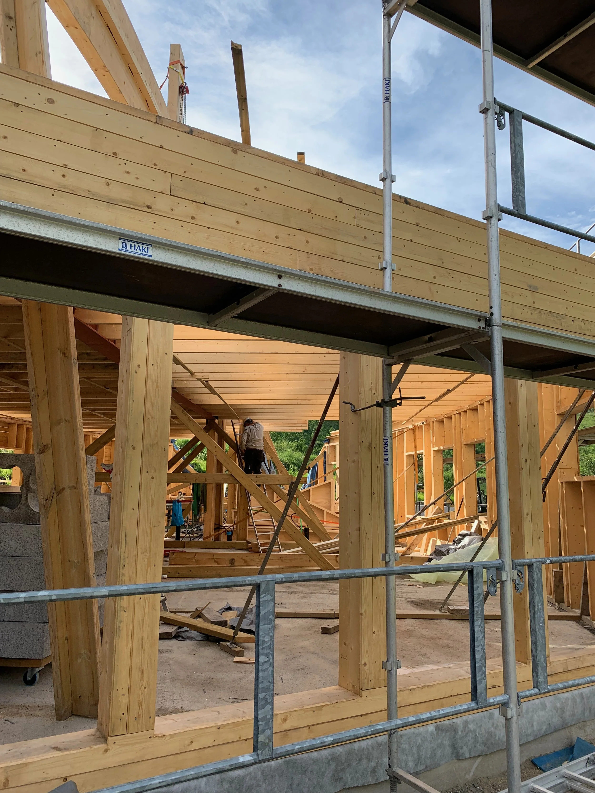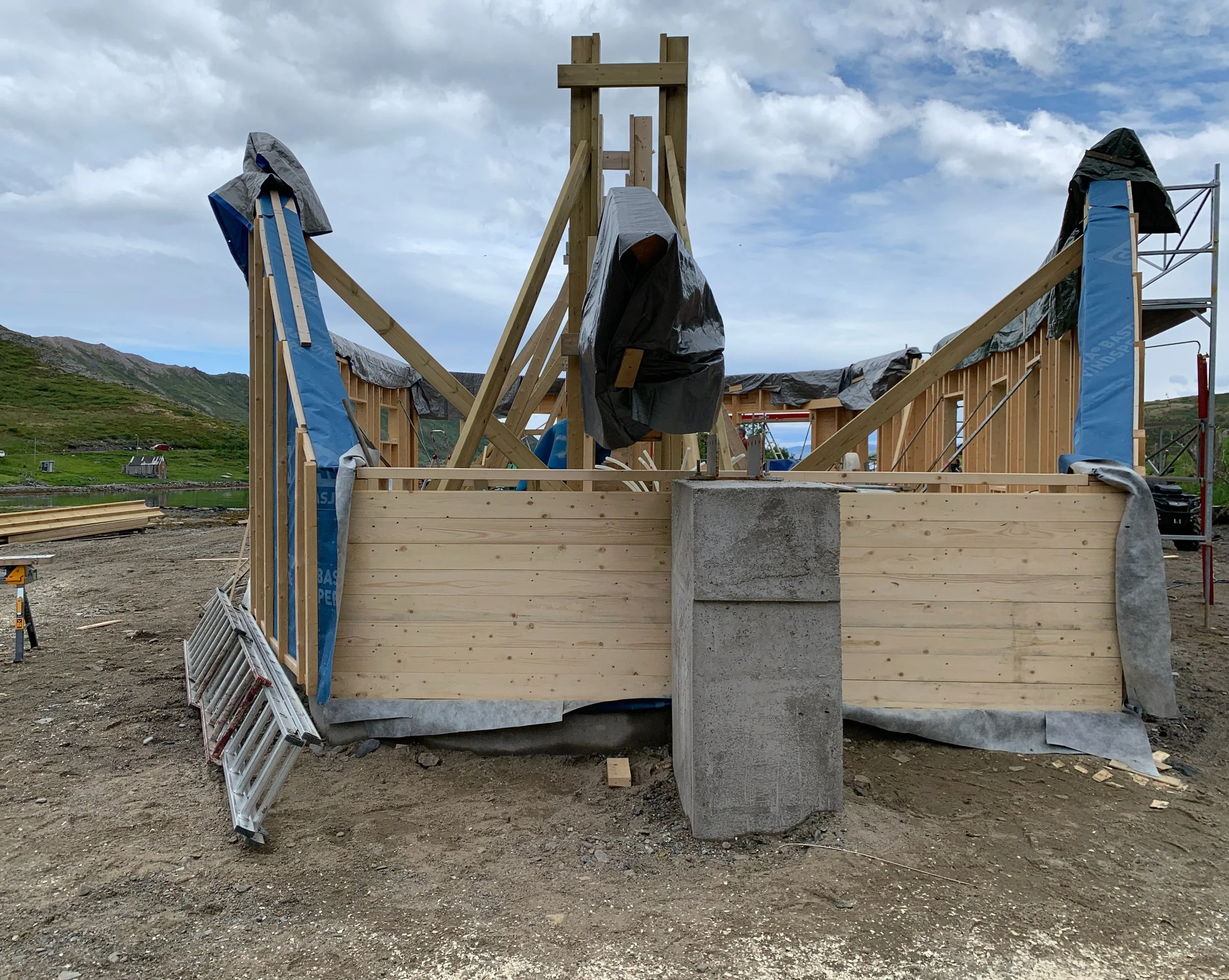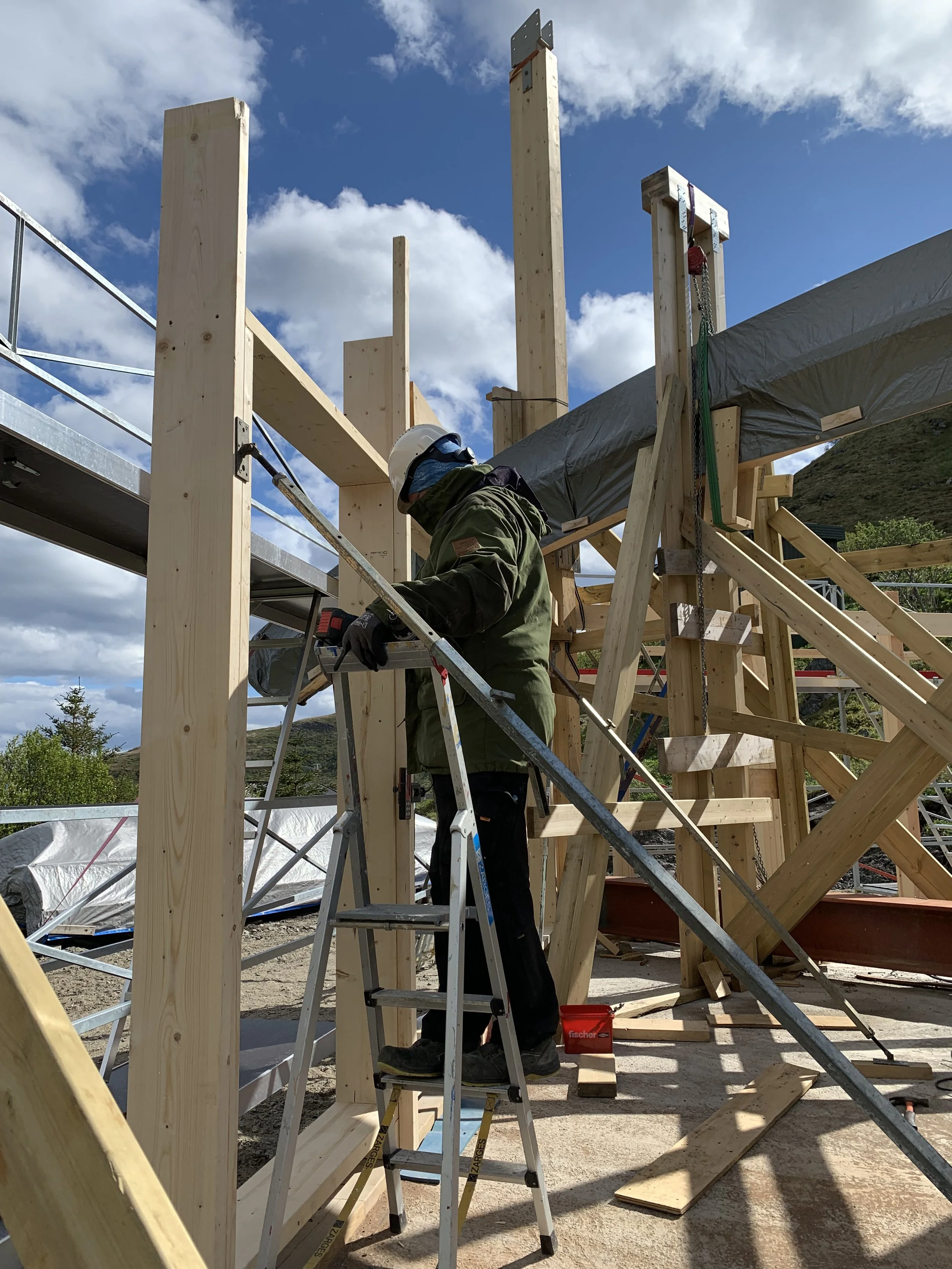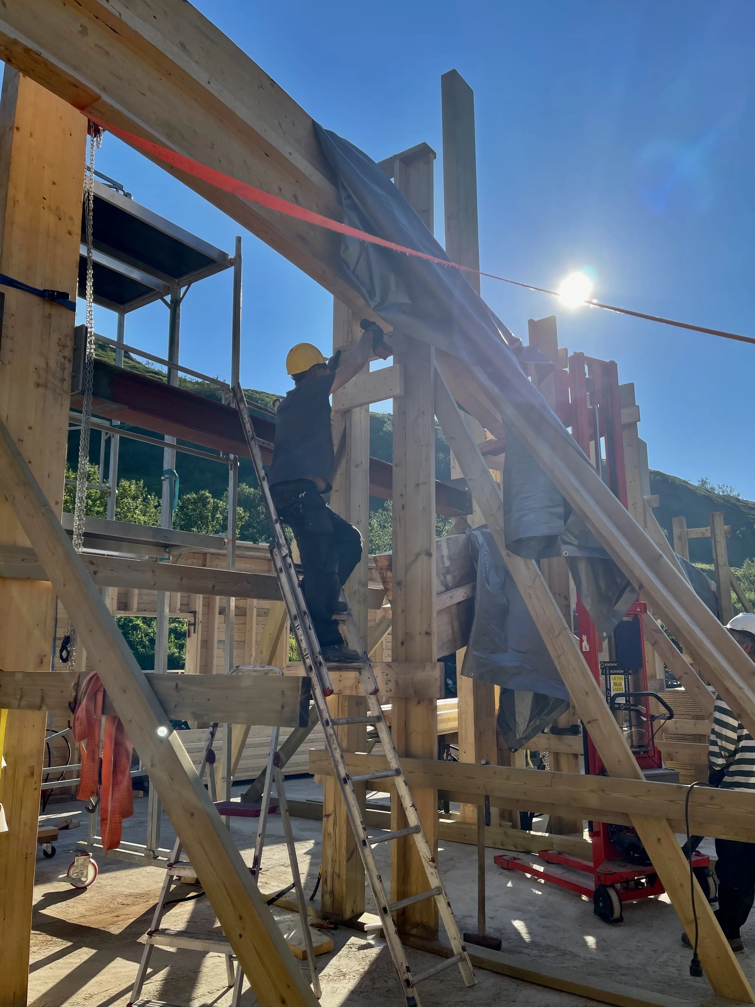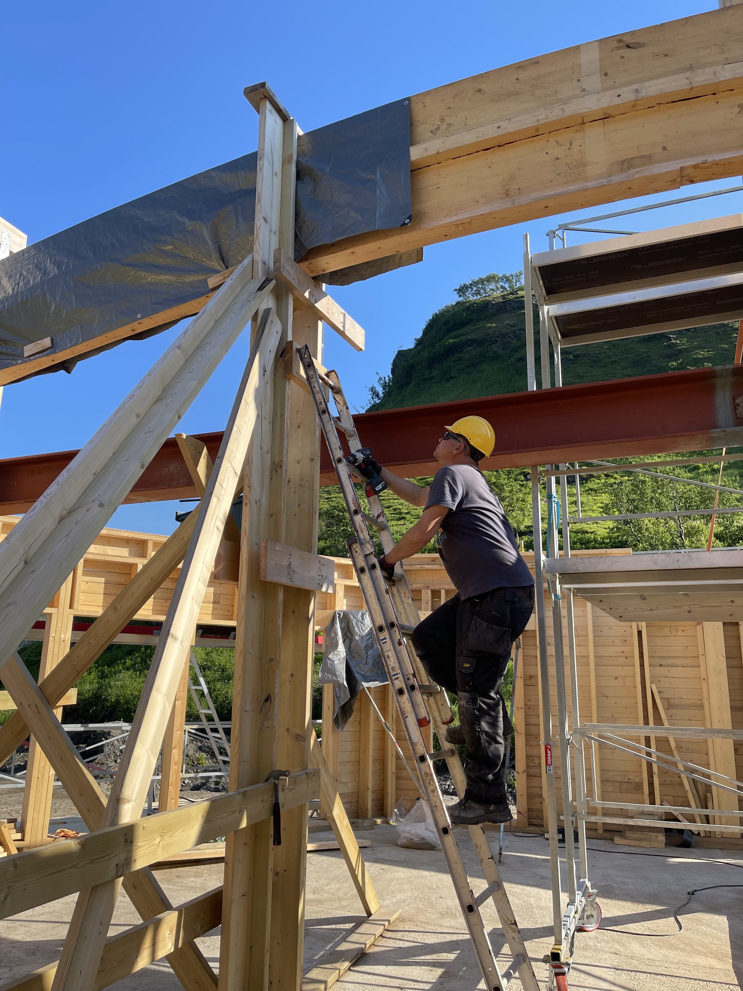 Den lengste buede vegg modulen, skal heises opp til gulv høyde for andre etasje- her skrur de en løfte stropp fast i modulen, under en planke. Det er Knut og Adrian som jobber på og det er interessant å følge med- (“åja, gjør dere sånn? æ trudde …bla bla”)
