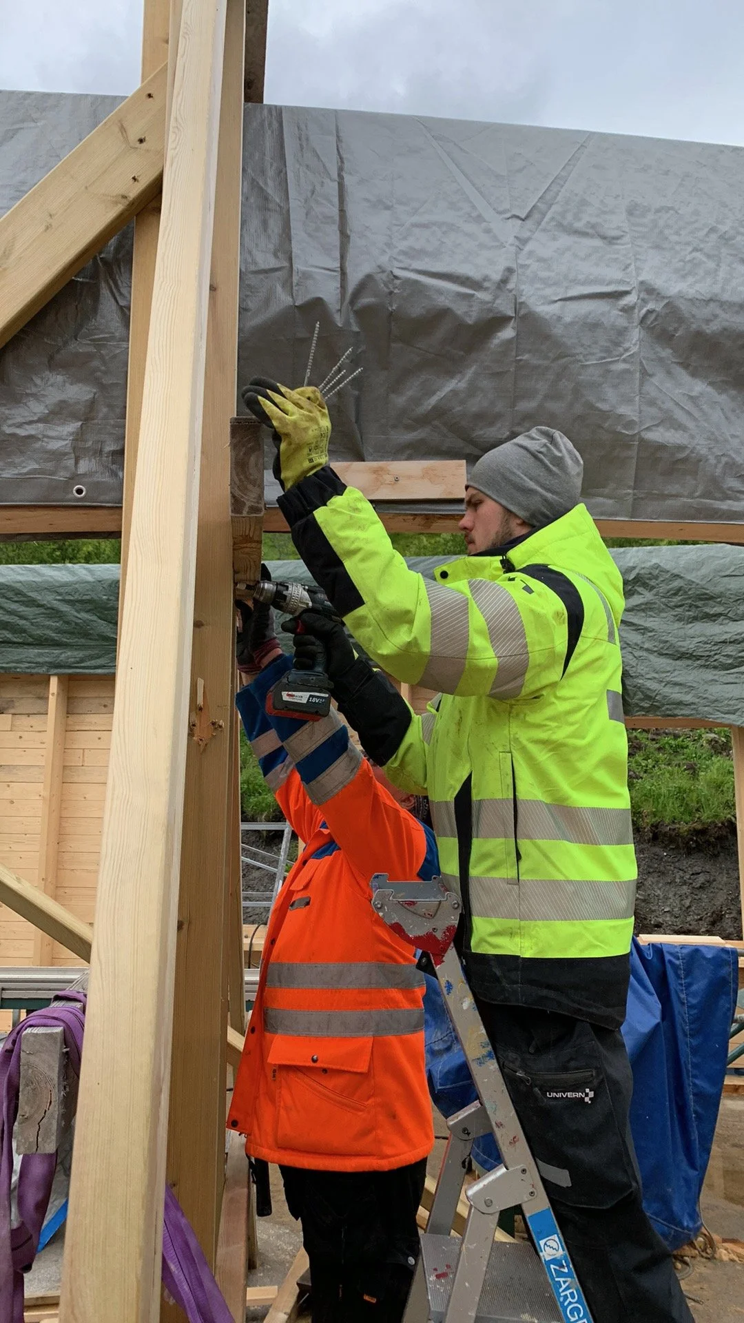 Adrian og Knut, i hver sin stige, nå er det toppen av bjelkeveggen som gjenstår -