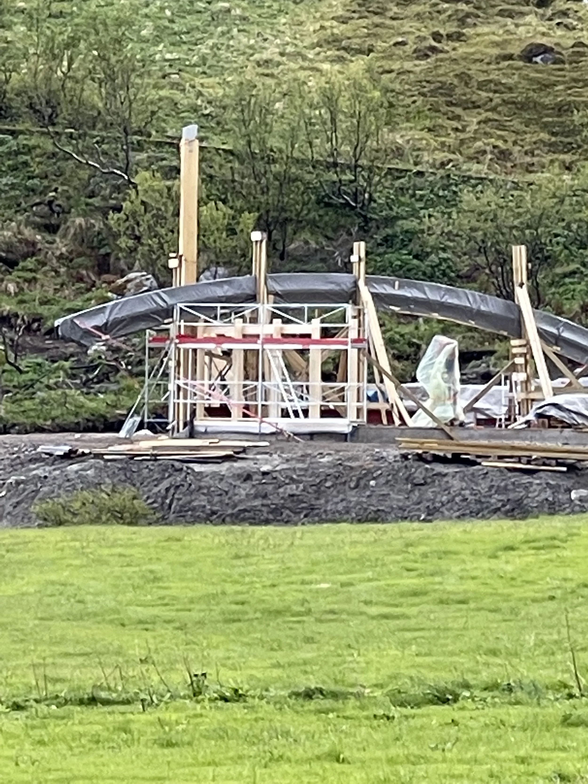 Den første og største søyla ble reist sist i mai, og etterpå, ble det reist to søyler og satt opp to jern bjelker i løpet av en lang dag……. Alt var lagt til rette for det, ved forarbeidet, men det var nesten ikke til å tru, at det var mulig. -