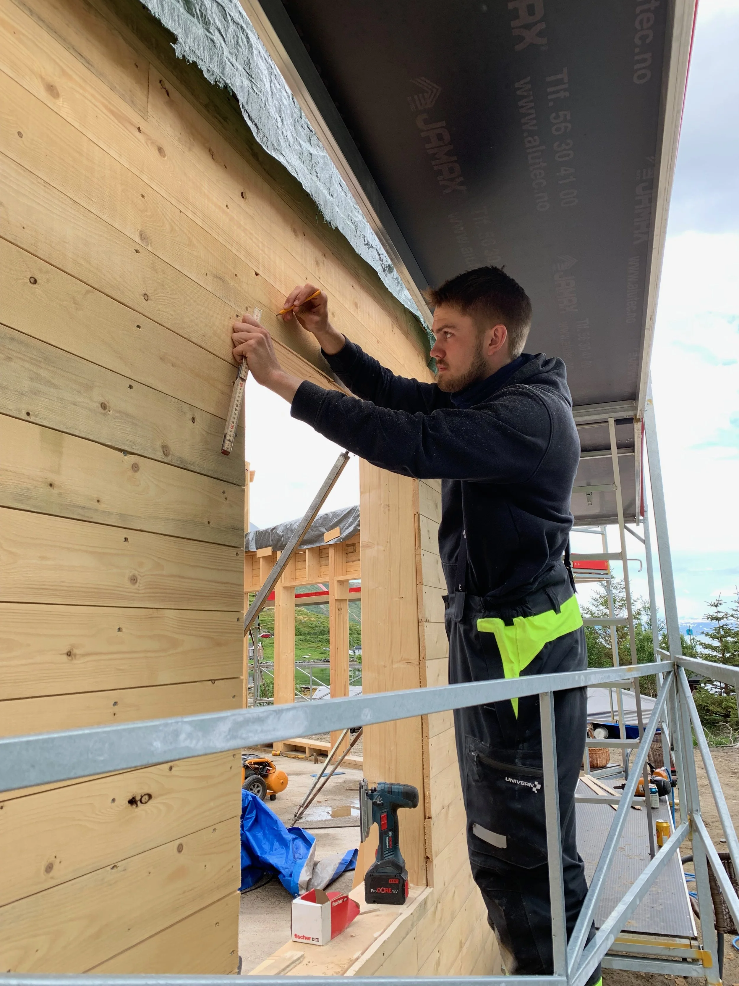 Bygnings assistent Adrian får så mange forskjellige oppgaver, her med tomstokk og blyant, — det var noe med - vindusåpninger og innenfra og utenfra, som skulle stemme.
