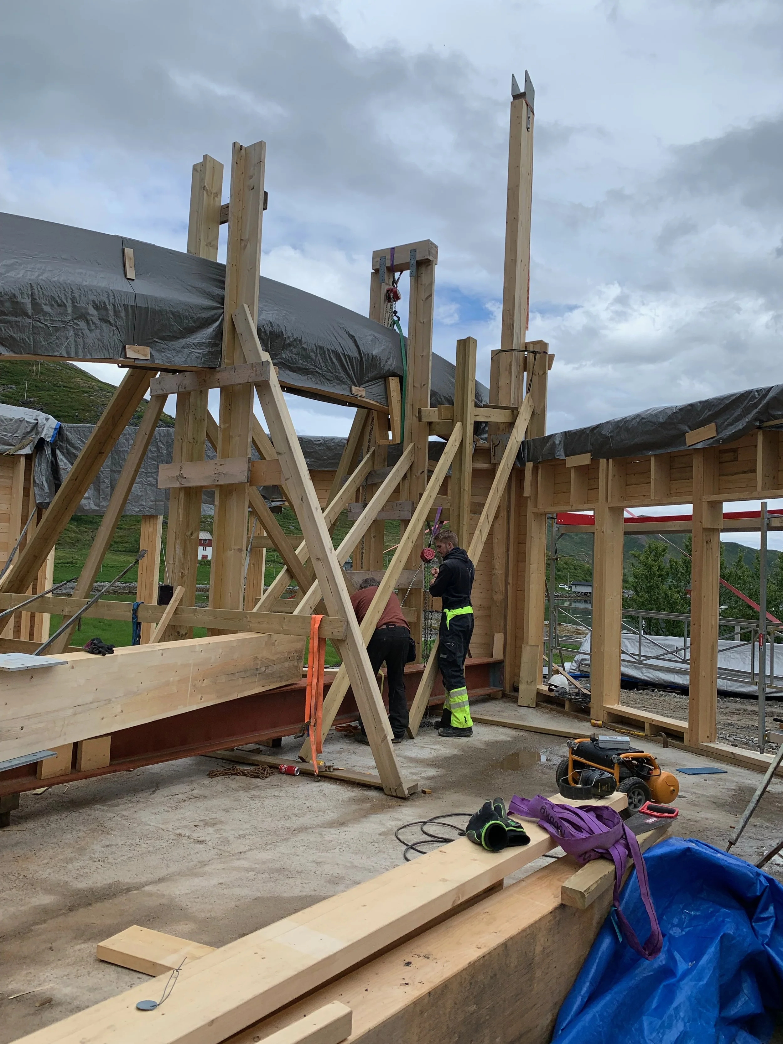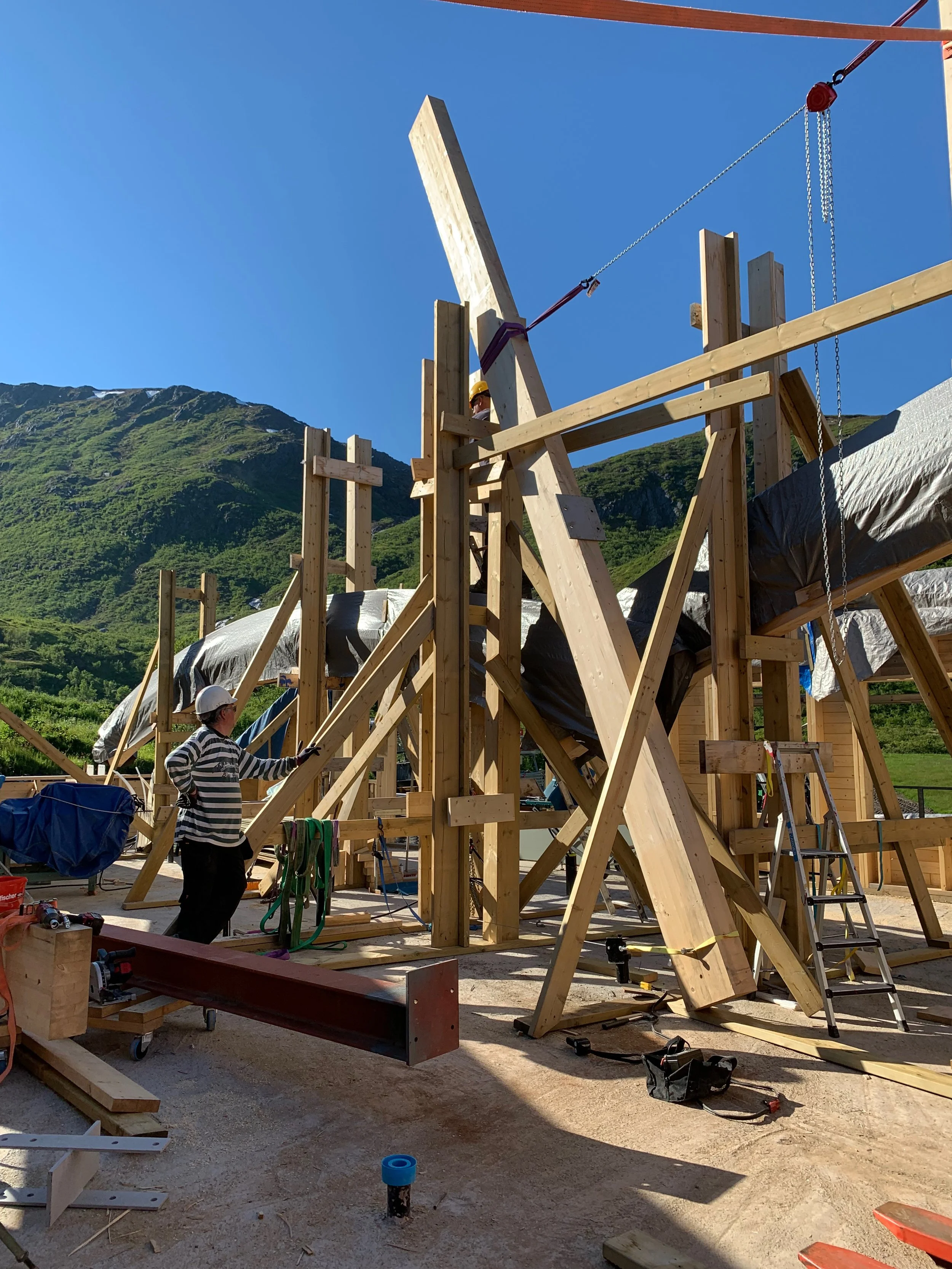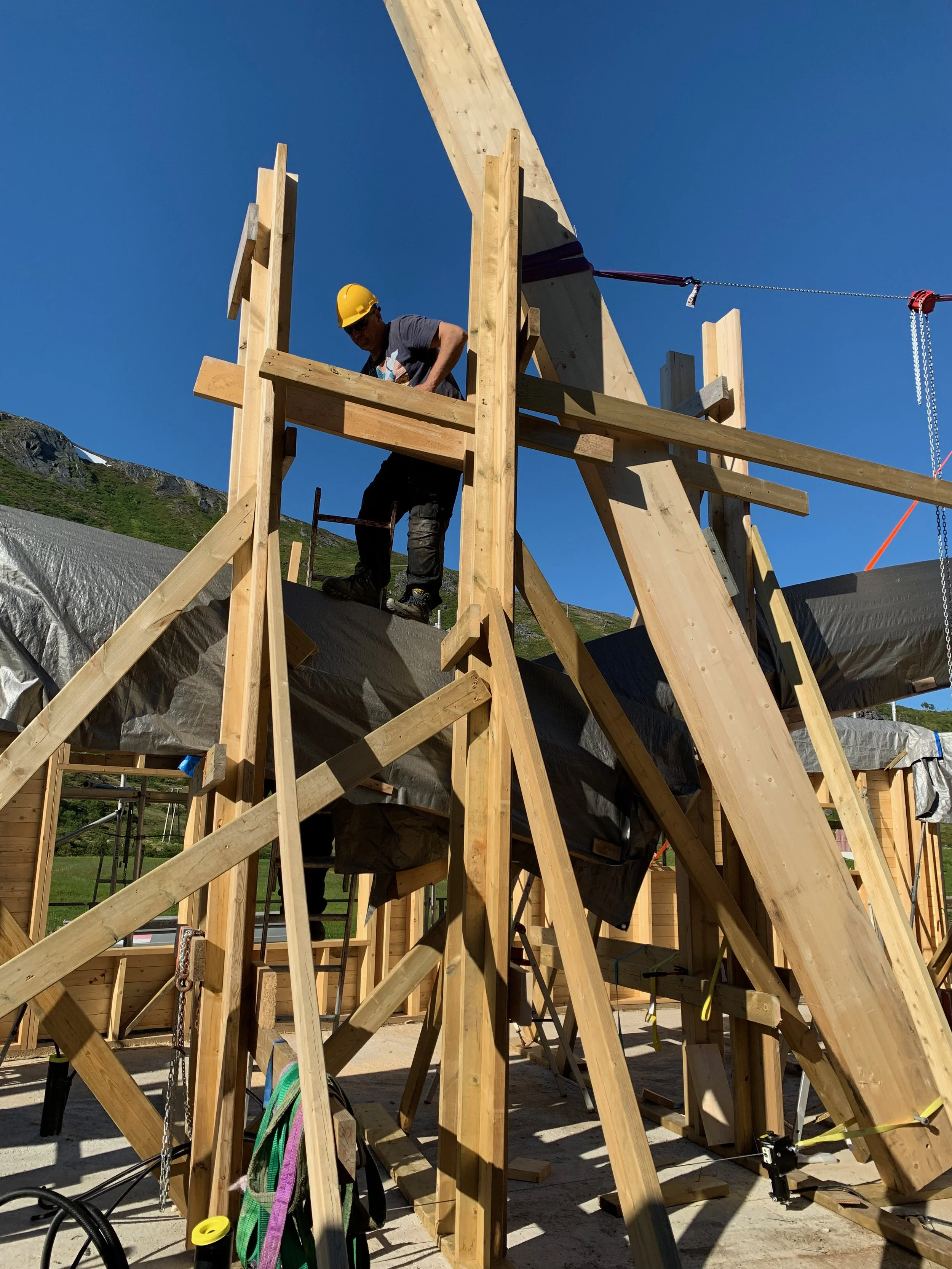 Klargjøring og heising av søyler, bæresøyler for storbuen.